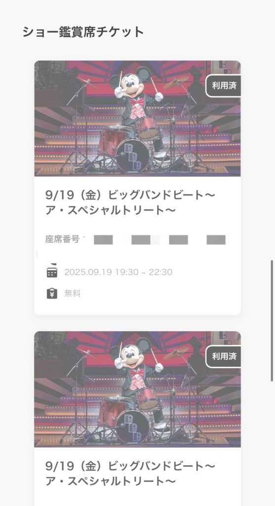 スクロールするとビッグバンドビートのチケット画面があり、こちらをキャストさんに見せて人数分タップしてやっと入れます。