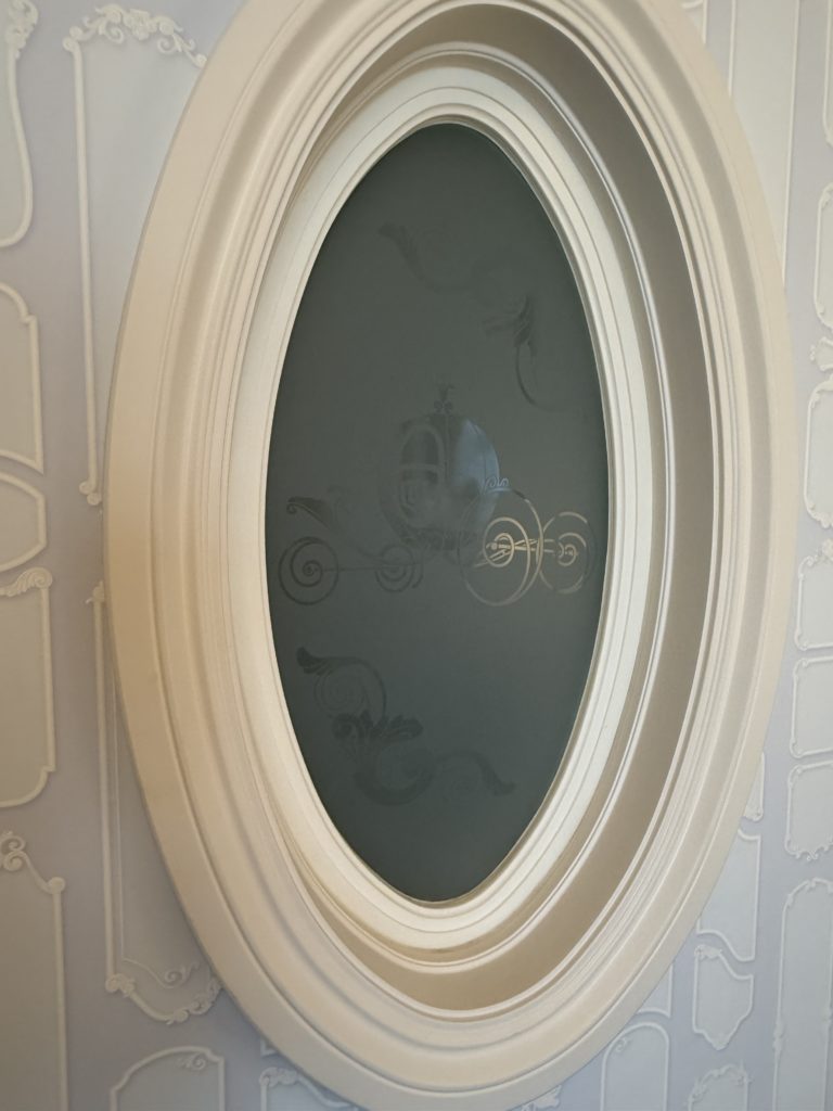 見てください!リビングルームからのバスルームの窓の絵がカボチャの馬車になっているんですよ〜